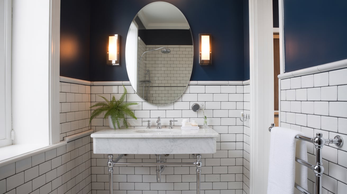 I wanted contrast in my small bathroom without feeling heavy. White subway tiles paired with dark navy walls created a striking balance that felt both bold and cozy.