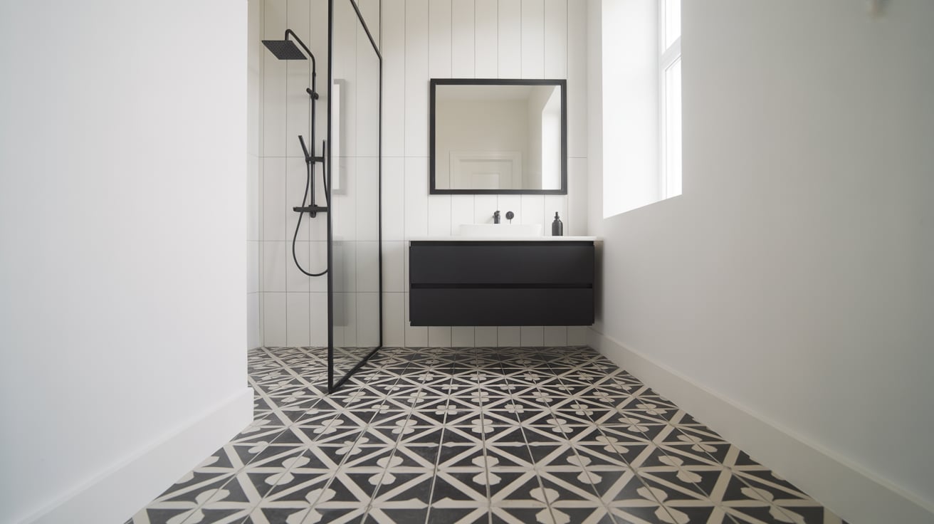 Pair bold floors with simple walls and minimal accessories — let the pattern be the star.