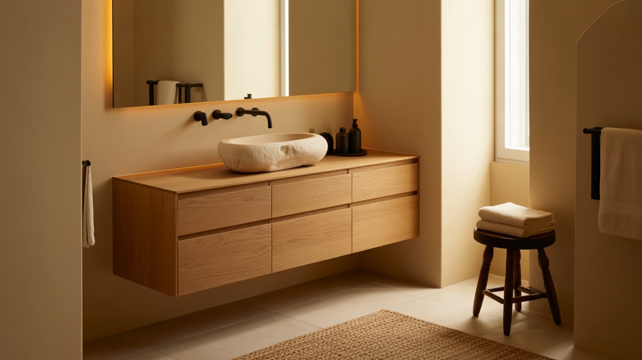 This combo works in both large and small spaces because it feels natural and grounded. It’s perfect if you want that “modern spa” look without making it feel cold.