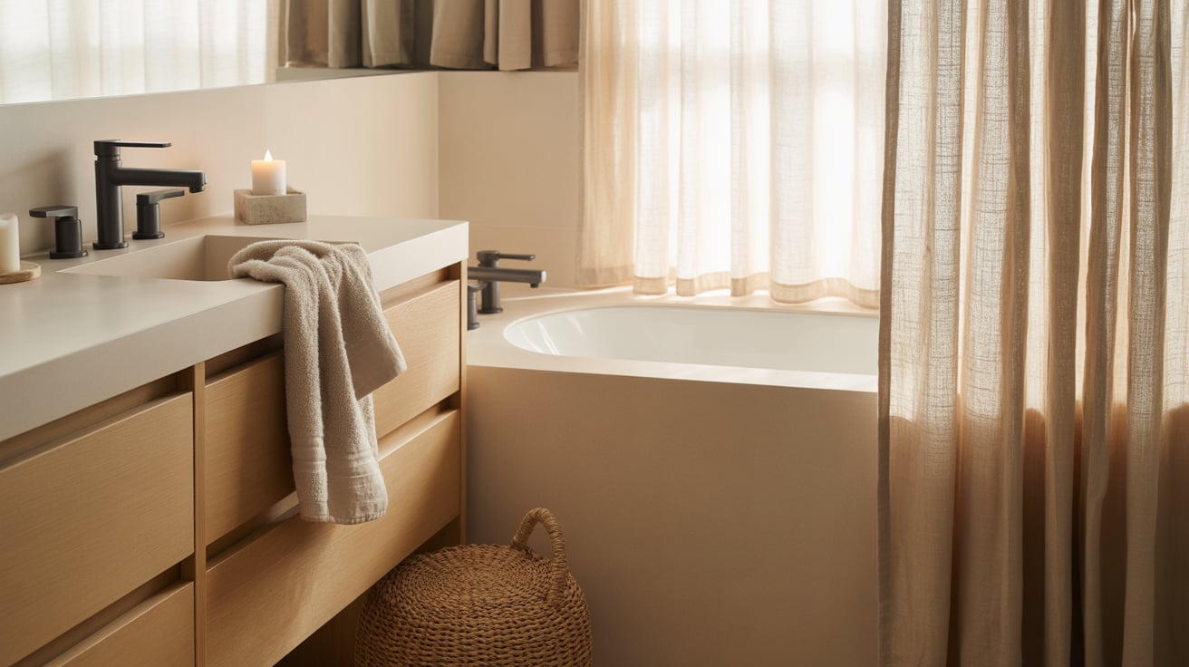 I once designed a bathroom using beige tiles, linen shower curtains, and black hardware — the result was soothing yet stylish.