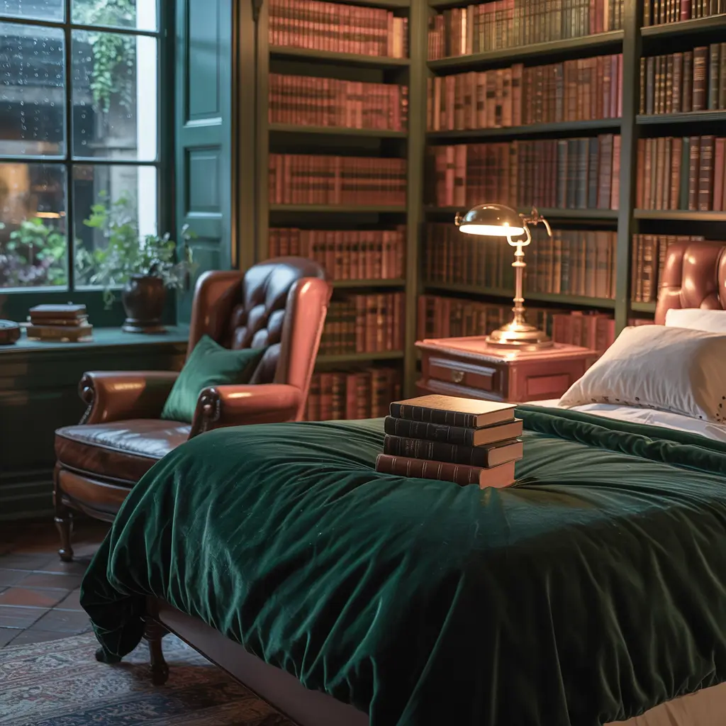 Think rich, dark colors—deep greens, burgundy, navy, chocolate brown, and lots of black. You’re combining vintage elements with academic references, creating a space that feels both mysterious and comforting.