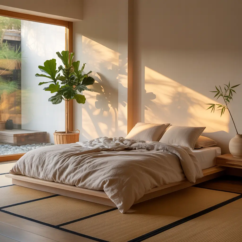- Subtle Japanese influences (shoji screens, bonsai, simple pottery)