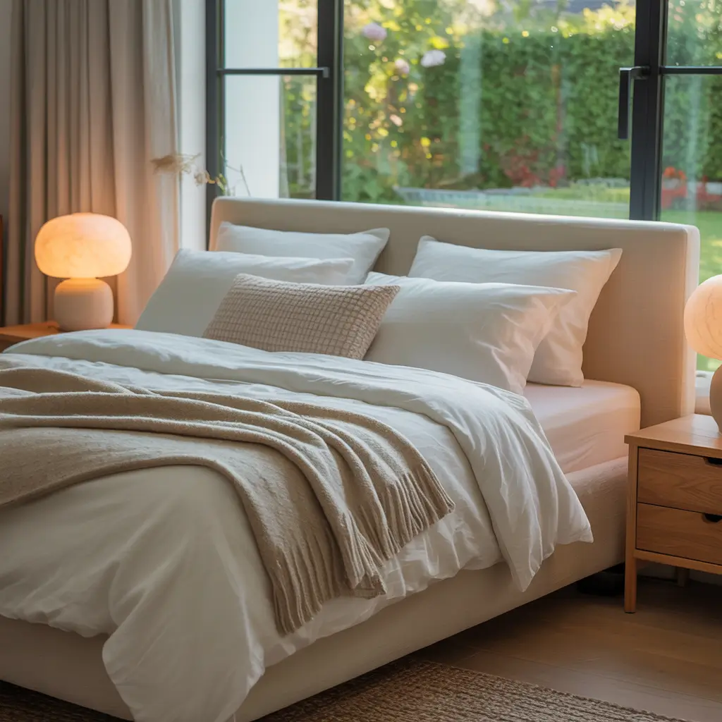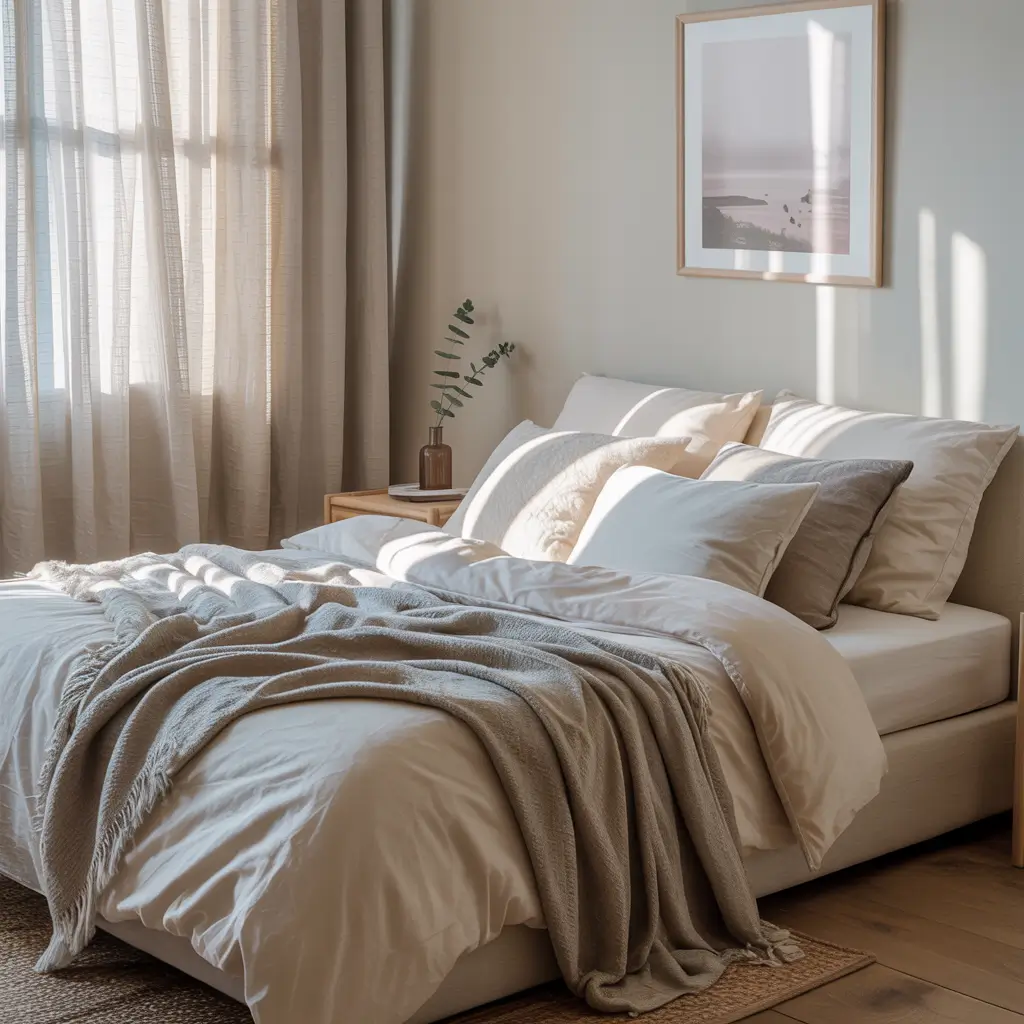 - Layered bedding in varying neutral shades (white, cream, taupe, gray)