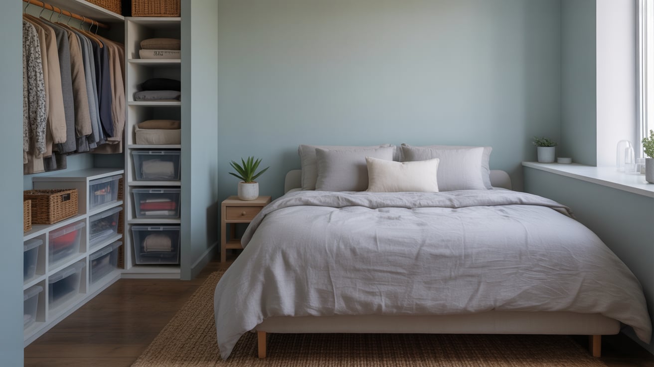 Maximizing closet space works because it frees the rest of the bedroom and keeps items accessible. Apply this by adding vertical organizers, bins, hooks, and double hanging rods.
