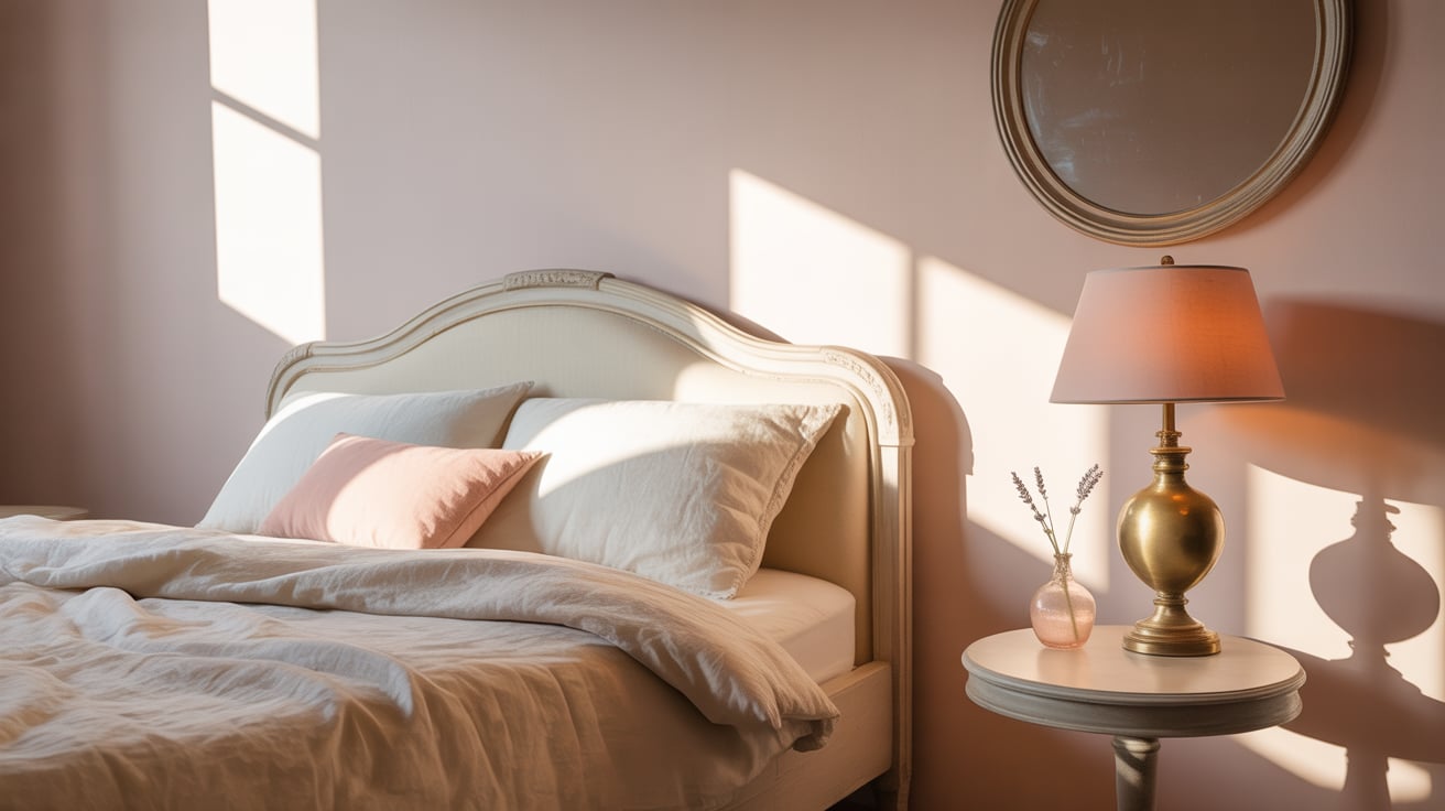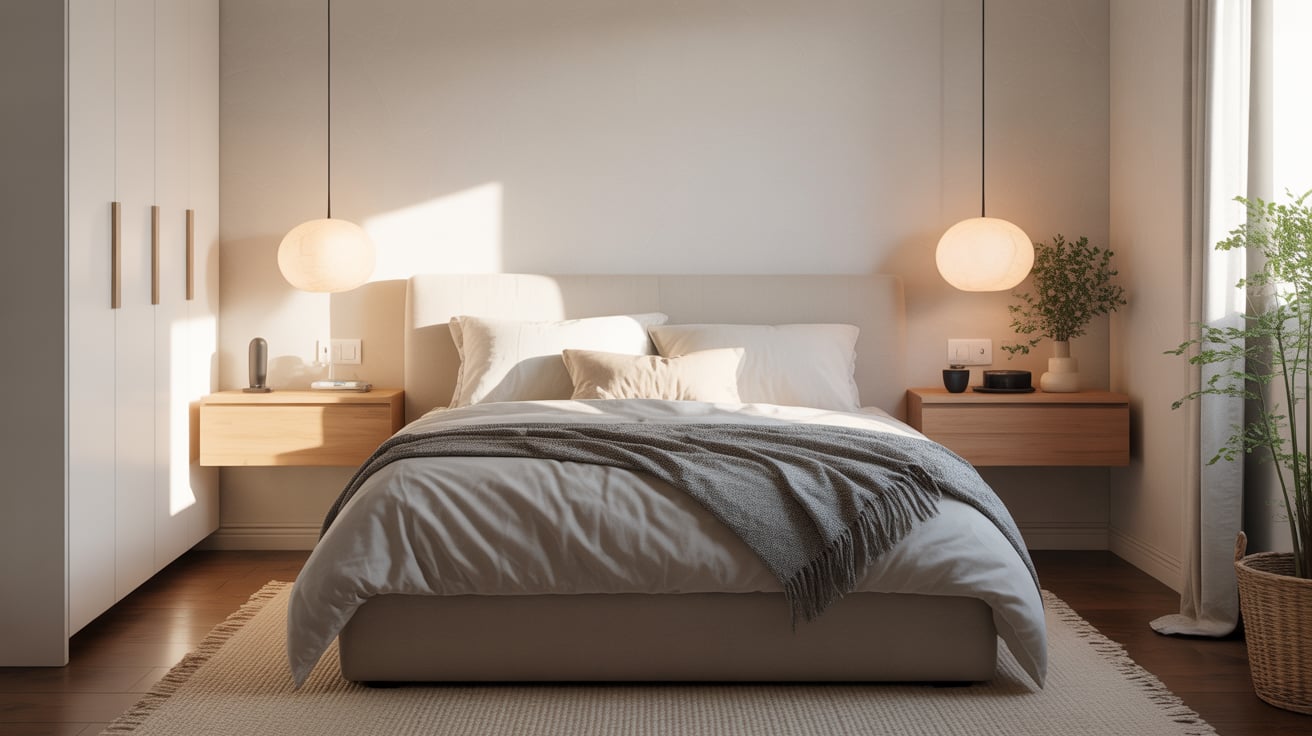 Floating nightstands work because they maintain functionality while keeping the room open. Apply this by mounting small shelves or minimalist tables next to the bed.