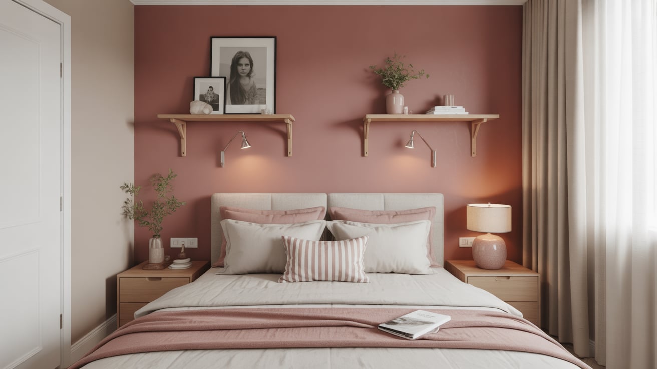Our tiny bedroom felt dull until I painted one wall a soft accent color and added a few floating shelves. It instantly became the focal point and added personality.