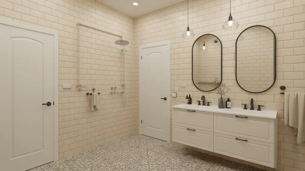 The beauty of this design is how it makes even small bathrooms feel spacious and airy. I’ve seen 40-square-foot bathrooms look absolutely stunning with this approach. The beige adds just enough warmth to prevent that sterile hospital vibe, while the white keeps everything bright and clean.