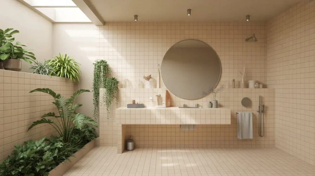 Plants and beige tiles? Match made in design heaven. The neutral beige background makes greenery absolutely pop, turning your bathroom into a fresh, spa-like oasis.
