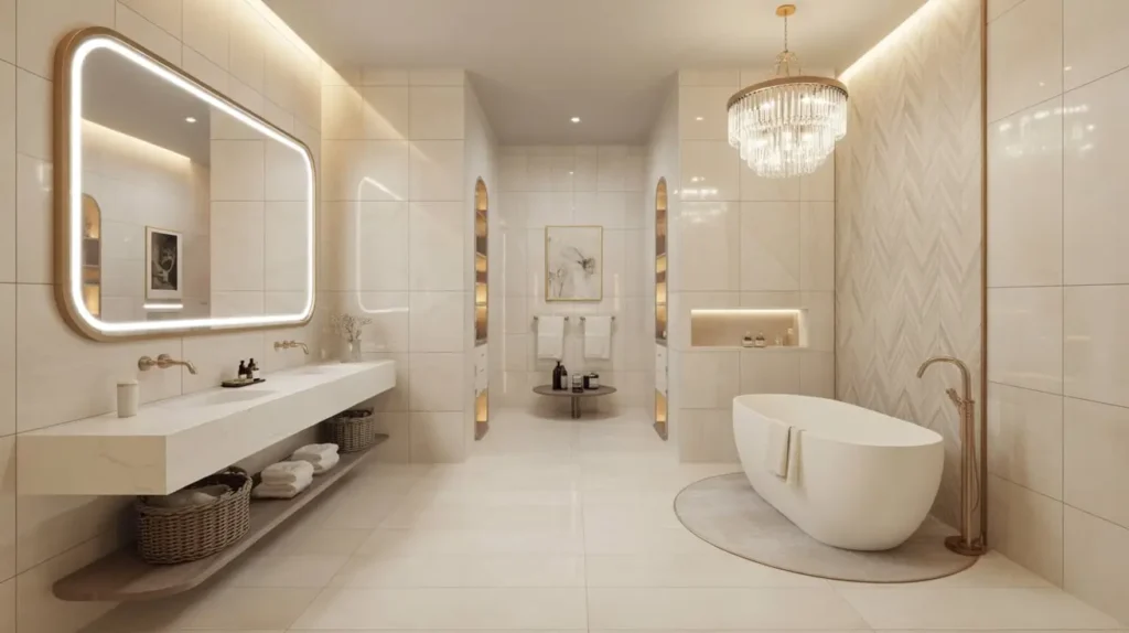 You know what makes a modern beige bathroom different from those dated ones? Clean lines and intentional design choices. I’m talking about large-format beige tiles that create fewer grout lines and give you that seamless, contemporary look.