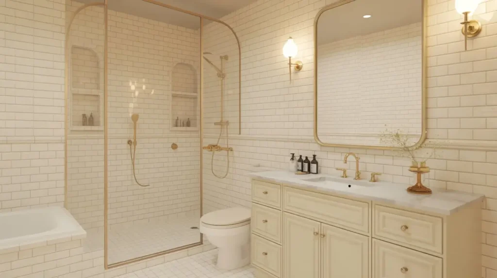 You don’t need solid gold fixtures (unless you’re feeling really fancy). Brushed gold, champagne gold, or even rose gold finishes work beautifully against beige tiles. The warm metallic tones complement beige’s undertones perfectly, creating a cohesive, luxurious look.