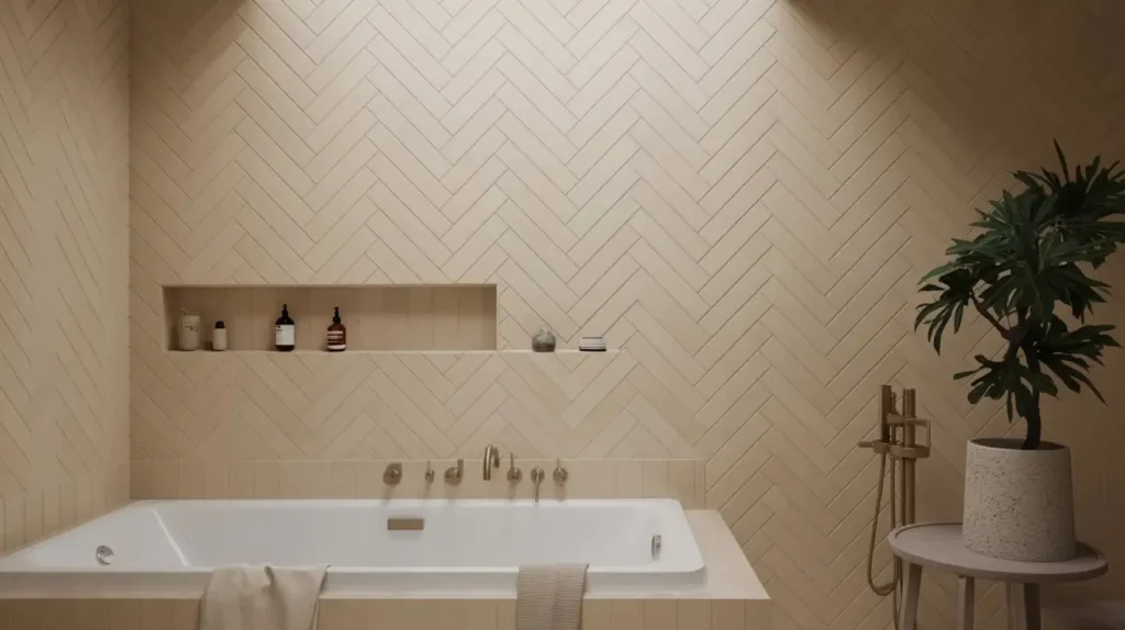Herringbone immediately elevates any space. I used beige herringbone tiles on my shower wall as an accent, and every single visitor comments on it. The pattern catches light differently throughout the day, creating subtle shadows and depth that flat-laid tiles just can’t achieve.