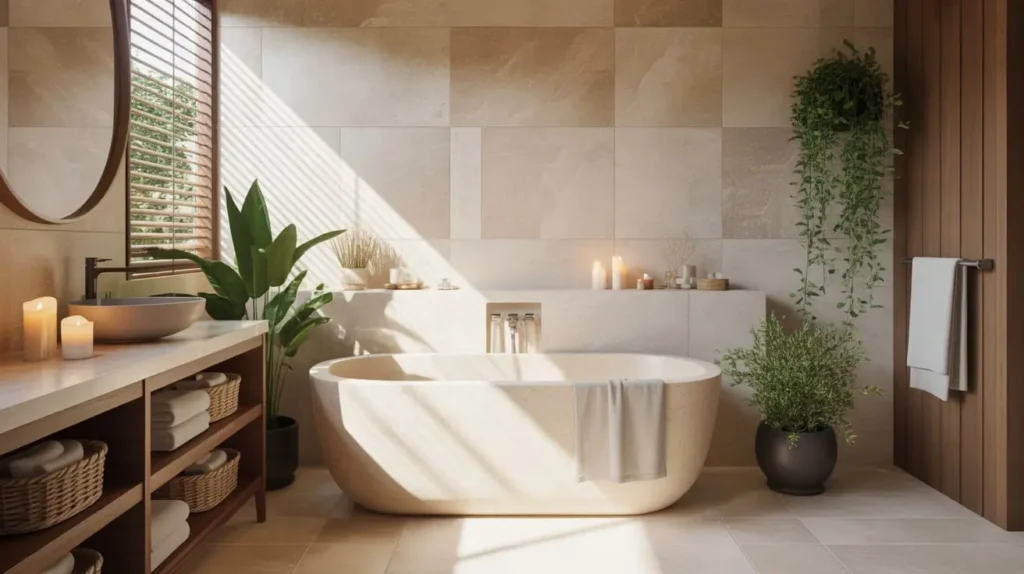 For a true spa vibe, you need to layer different beige textures. Use smooth beige porcelain tiles on the walls, then add textured stone-look beige tiles in the shower. The variation creates visual interest while maintaining that calming, monochromatic feel.
