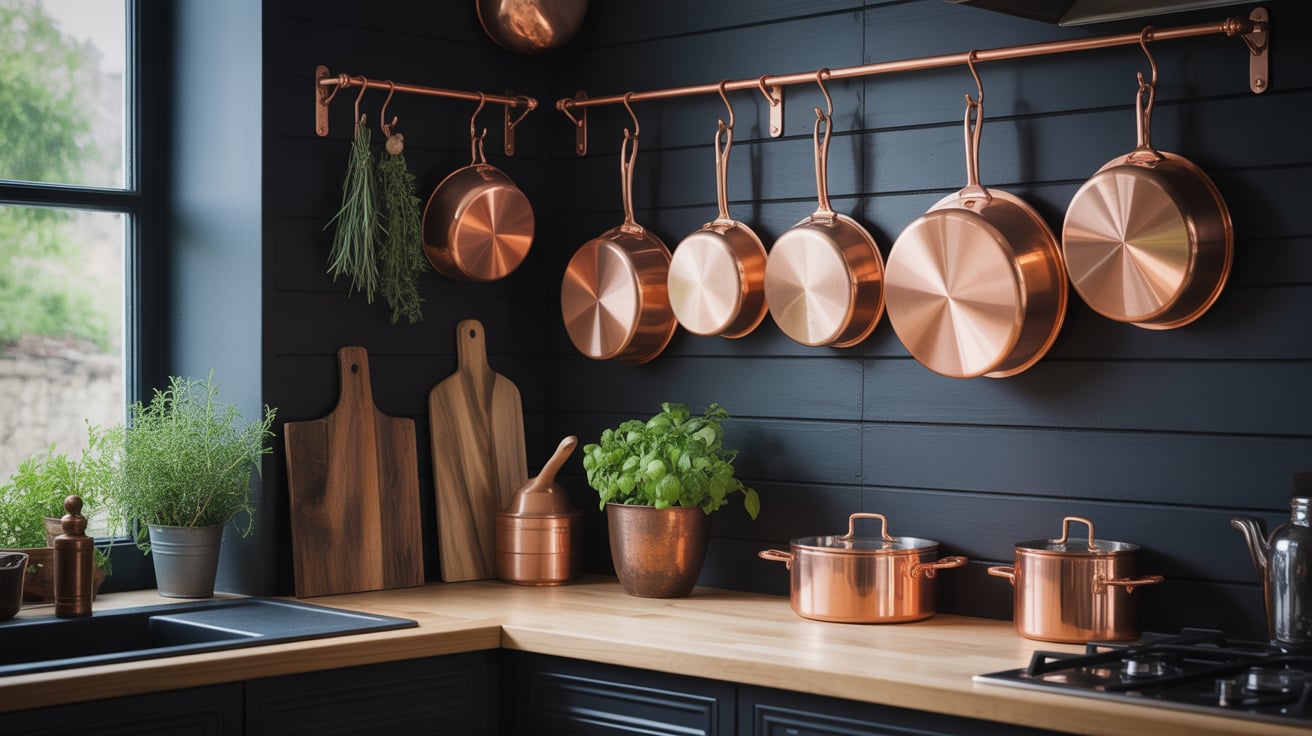 I grew up in a home where my mom hung copper pots on the wall — and now I know why it worked so beautifully. Against black walls, they look like art.
