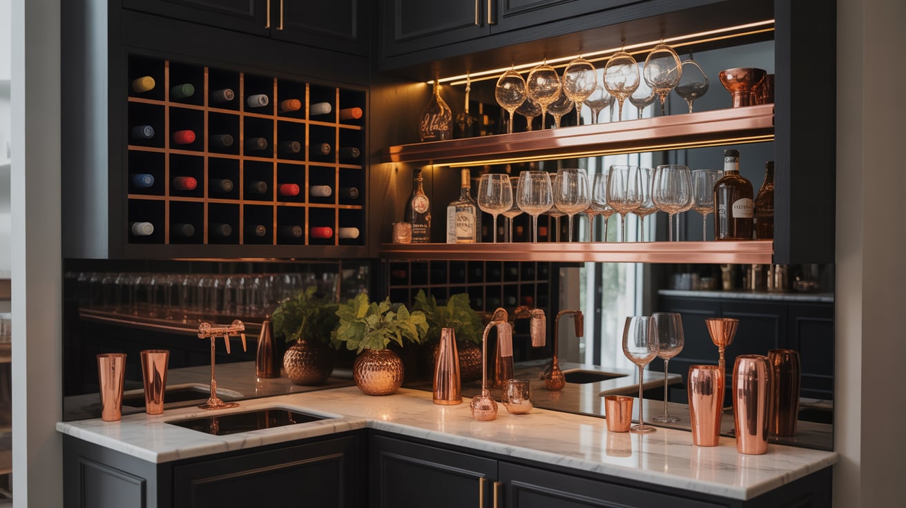 A small black and copper bar instantly adds luxury, even in tight spaces. It’s ideal for entertaining or adding a touch of glam.