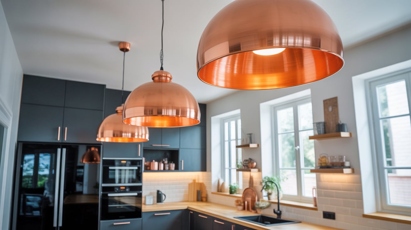 9. Copper Ceiling Fixtures with Black Appliances