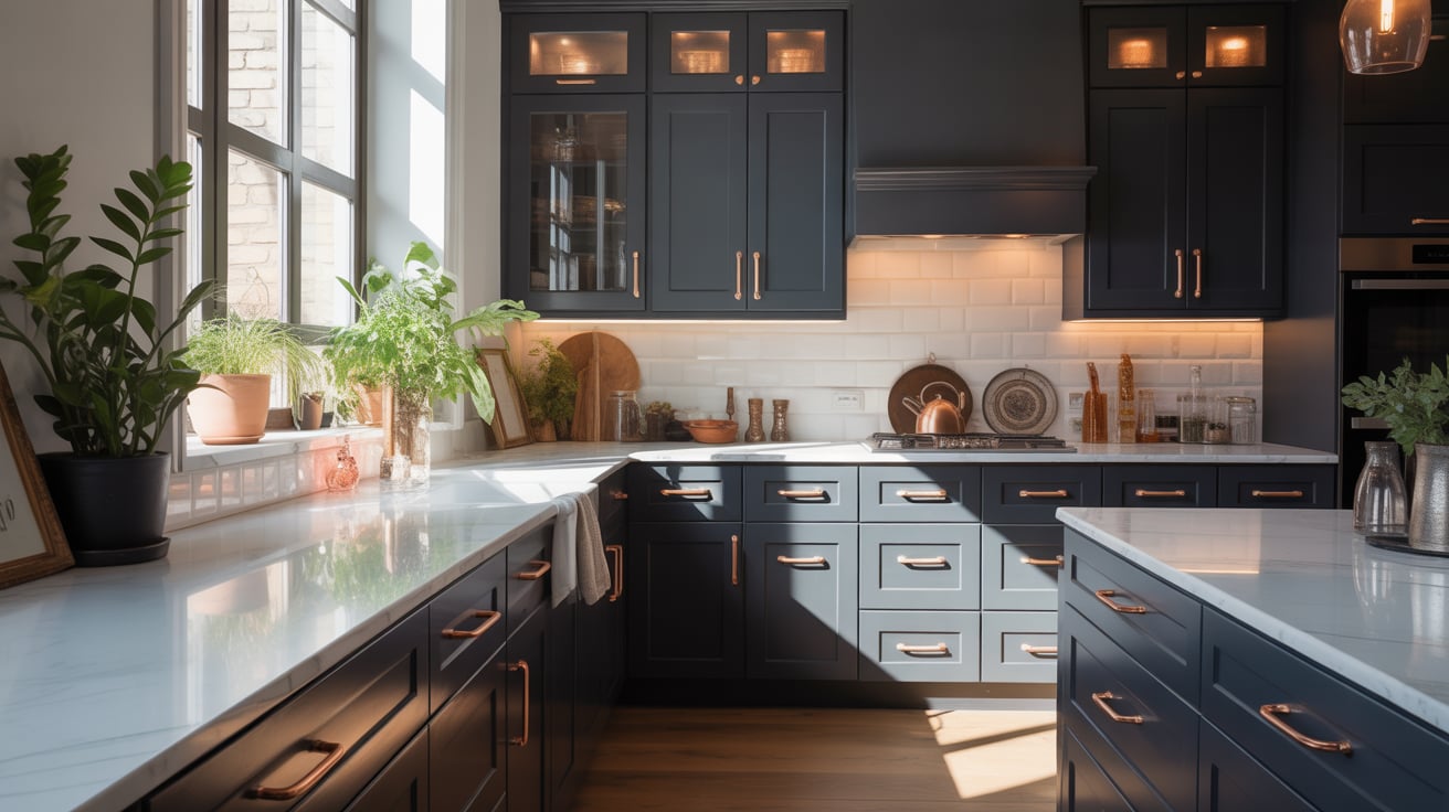 8. Two-Tone Cabinets: Black Base, Copper Uppers