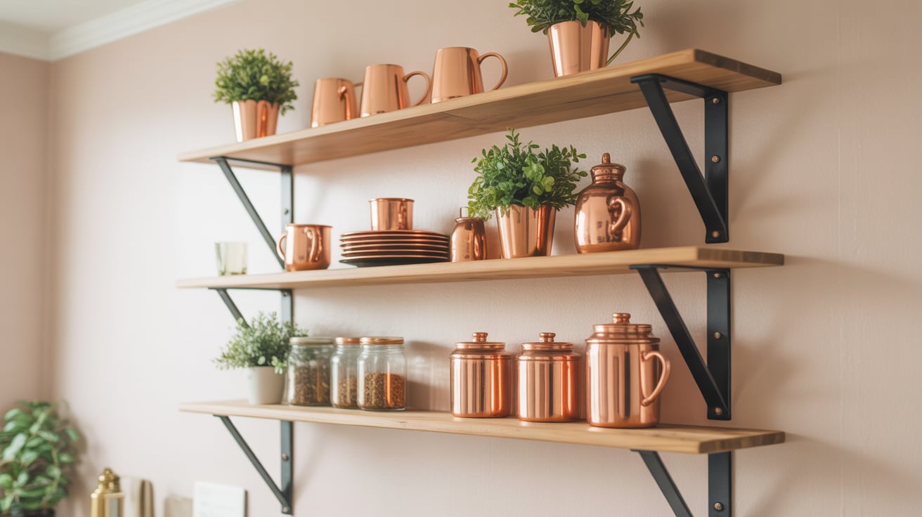 When I moved into my small apartment, I replaced bulky cabinets with open shelves — best decision ever. Adding copper jars and mugs made the whole wall pop.