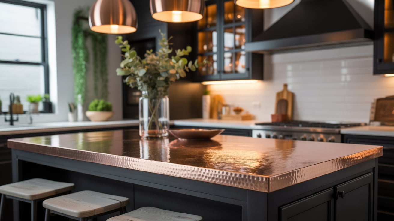 A bold idea I once saw in a boutique hotel kitchen — a black island topped with hammered copper. It felt so rich and unexpected.