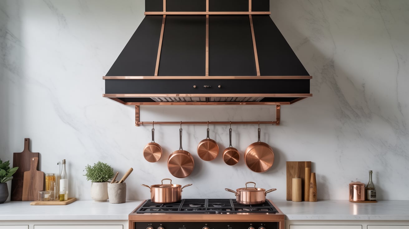 A client once told me her kitchen felt “too safe.” We added a bold black range hood trimmed with copper — and it instantly became the showstopper.