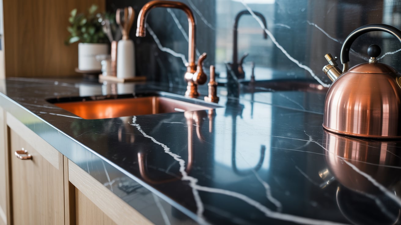 4. Black Marble Countertops with Copper Accents