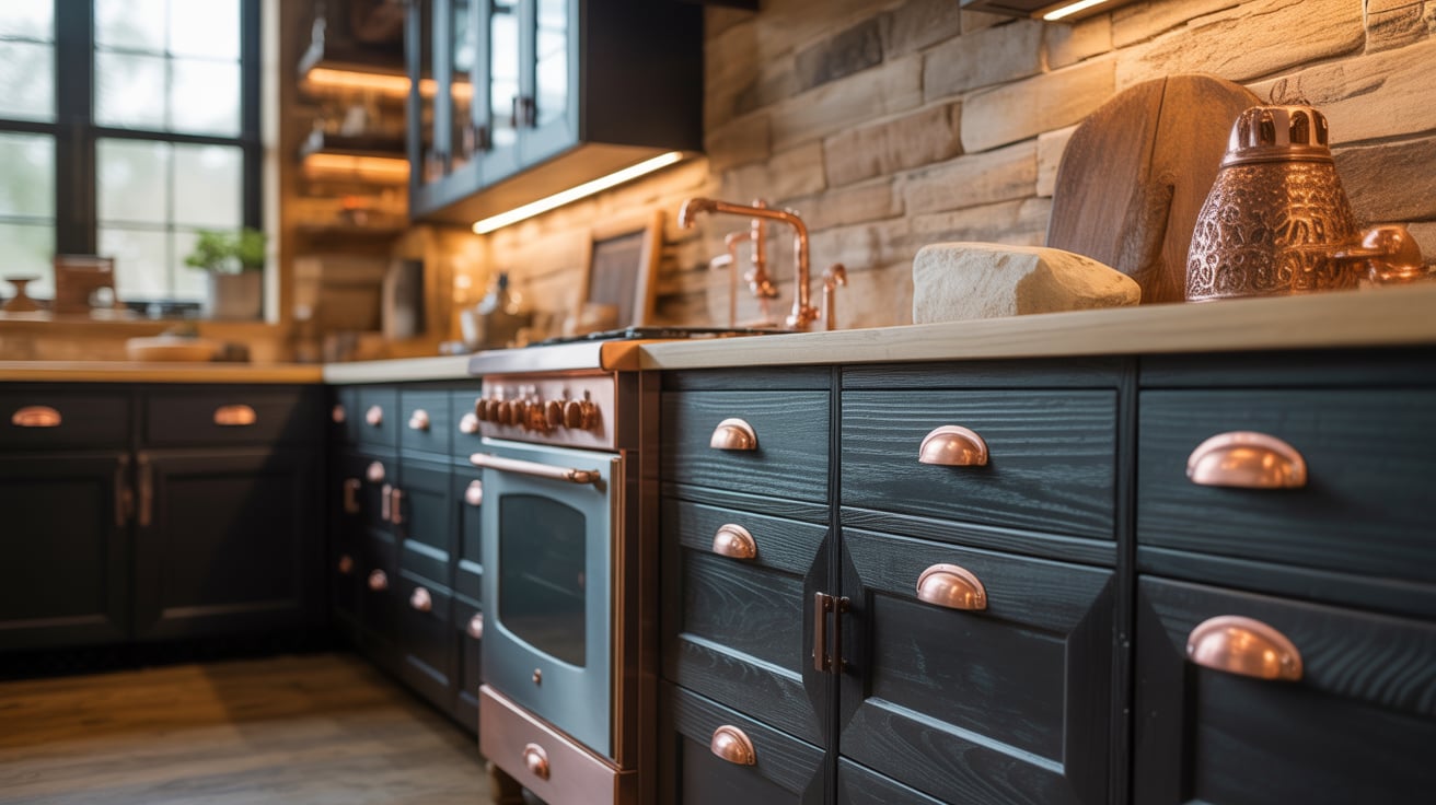 When I helped a friend renovate her rustic cabin, we paired black wood cabinets with aged copper handles — the result was pure charm.