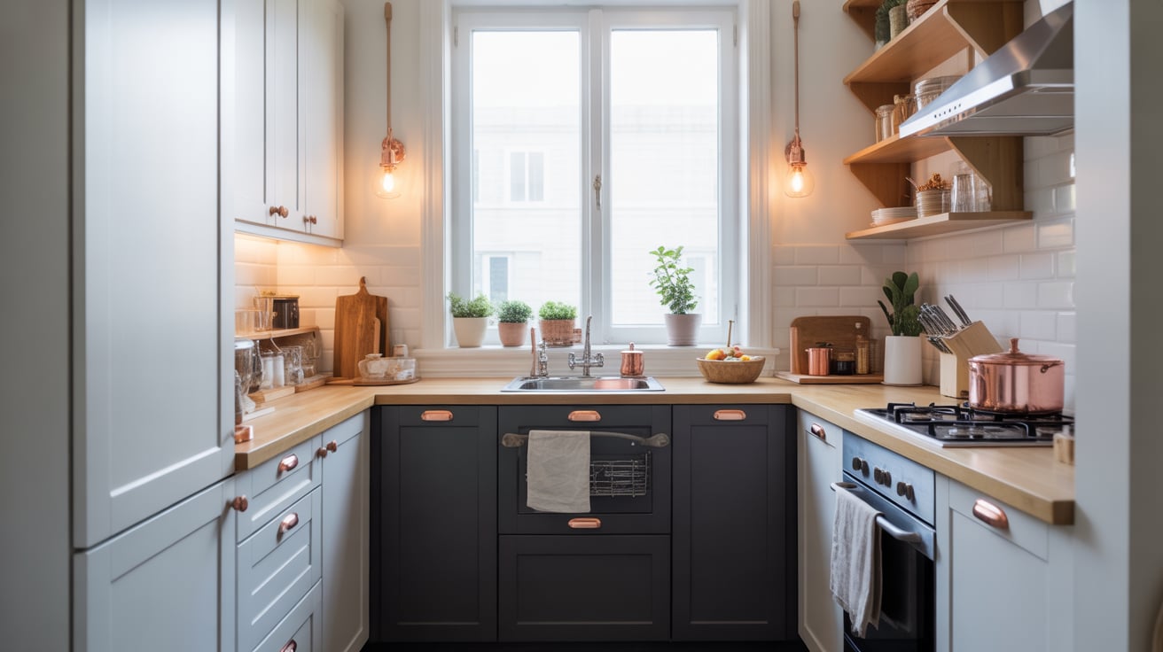 Living in a small apartment doesn’t mean settling for boring. I learned that adding a few shiny copper touches — like handles or lighting — instantly brightens the room.