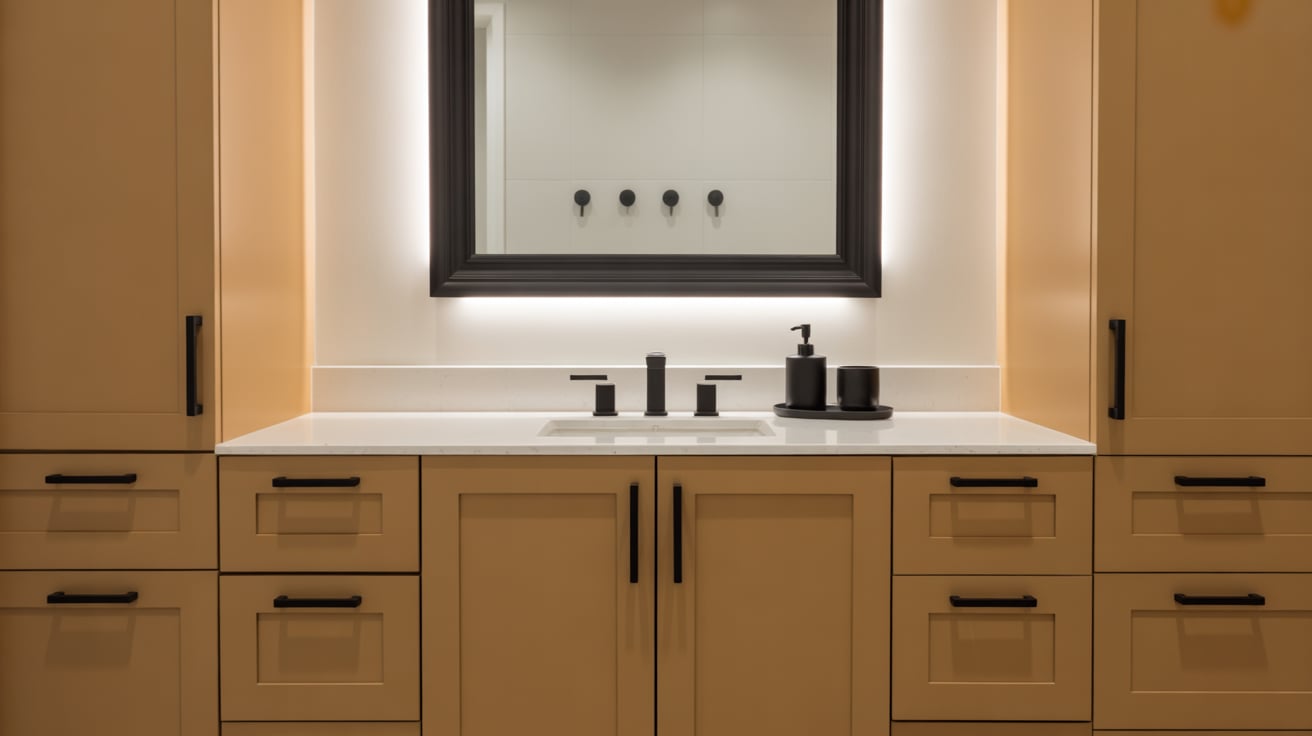 I tried plain tan cabinets in my last bathroom, but it felt boring. Adding black handles and knobs instantly upgraded the look and felt modern without extra effort.
