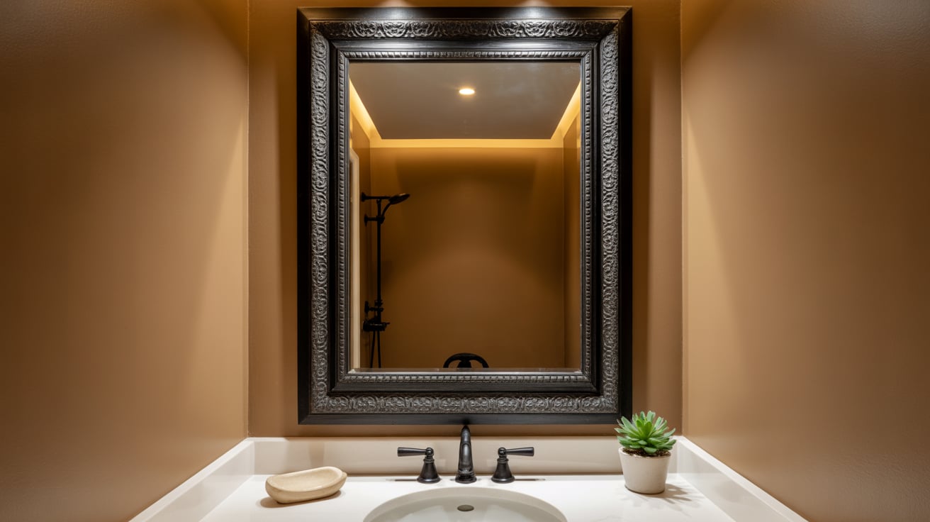 This idea works because black frames define the space visually, while tan walls soften the contrast. It’s a simple yet highly effective way to elevate any bathroom.