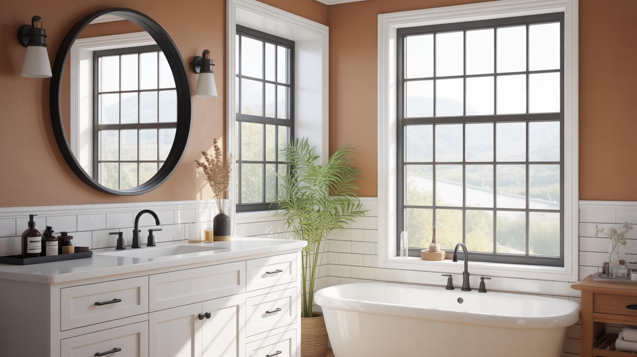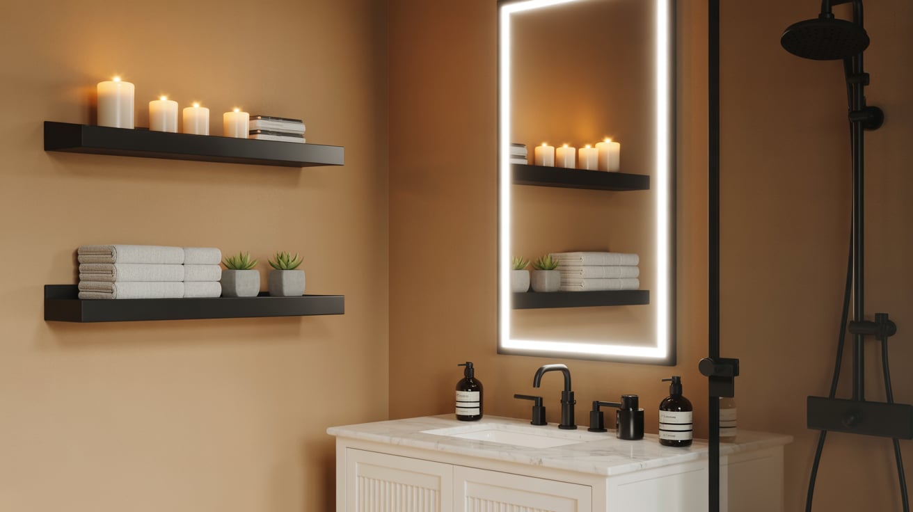 This works because black frames create strong visual lines while tan walls maintain warmth. It’s subtle but extremely effective in elevating your bathroom design.