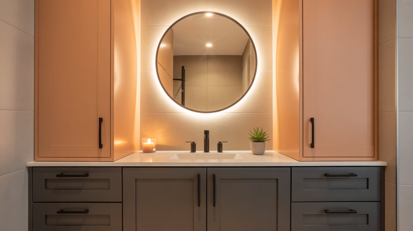 When I redesigned my small bathroom, I was worried dark cabinets would shrink the space. By painting the lower cabinets black and keeping the upper ones tan, it felt grounded yet airy.