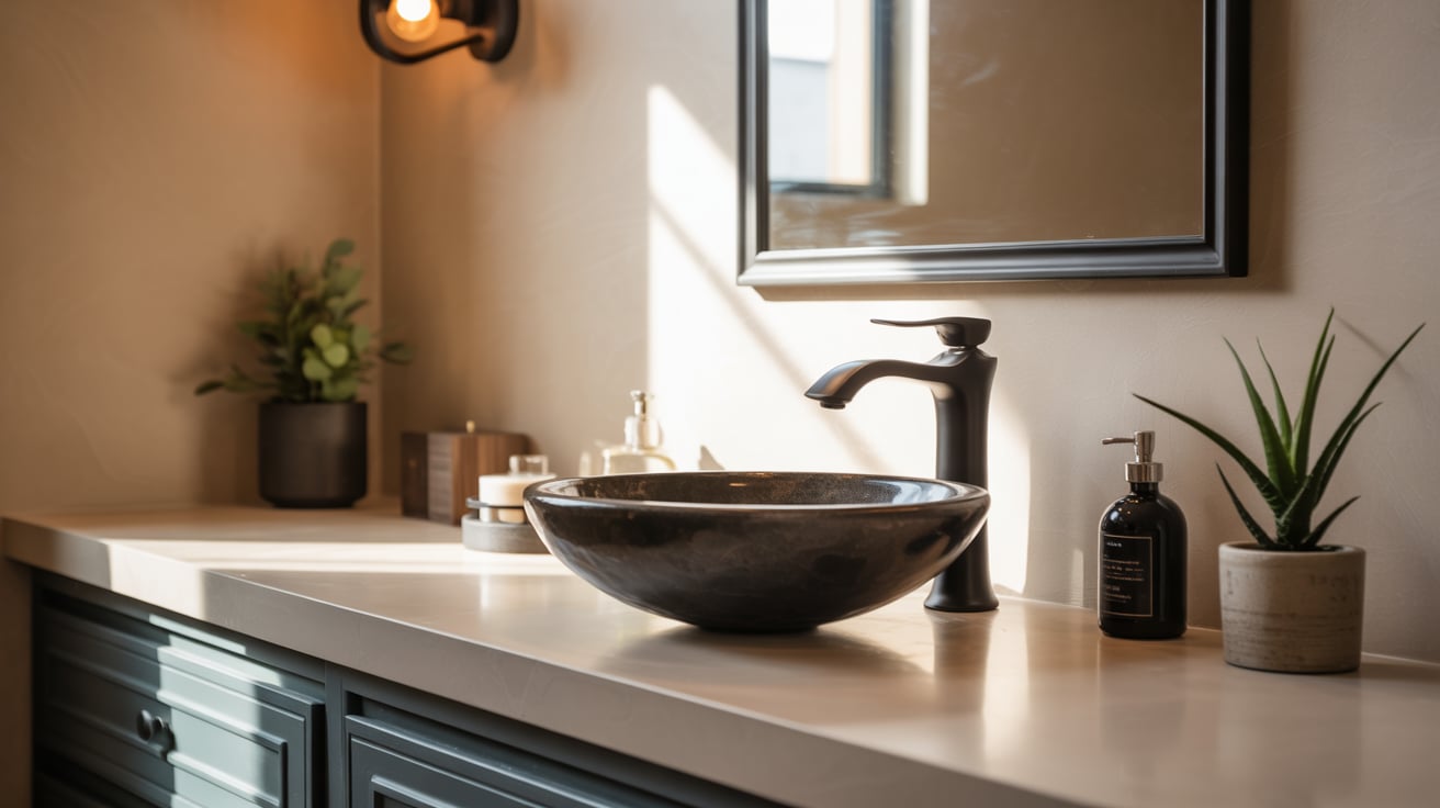I once installed a black sink in a stark white bathroom and it felt cold. Combining a tan countertop with a black sink added warmth while keeping the contrast striking.