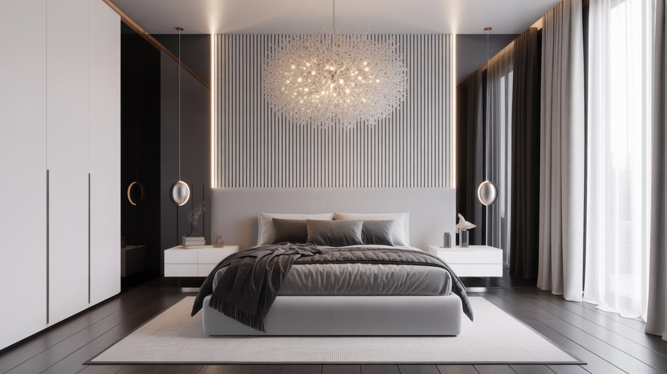 A bold chandelier or modern pendant lamp can become the centerpiece of your black and white bedroom. Go for geometric shapes or sleek metallic finishes that contrast beautifully with the simple color scheme.