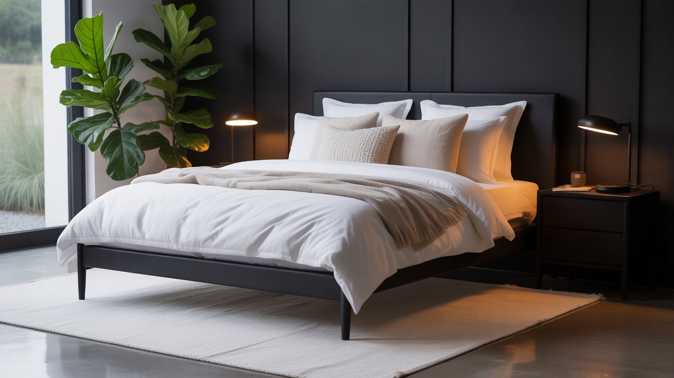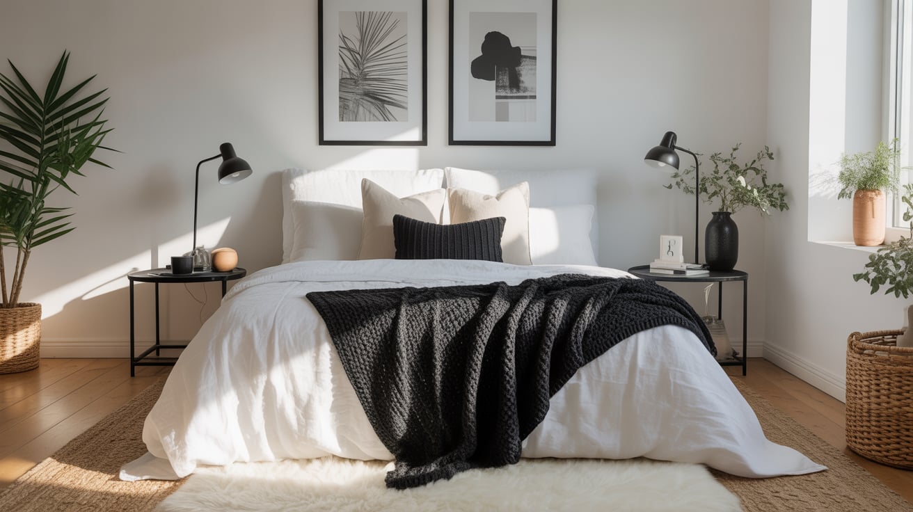 To elevate the look, mix smooth and rough materials — like a sleek black metal bed frame with a chunky woven blanket. It keeps your room from feeling too flat or cold while still looking stylish and inviting.