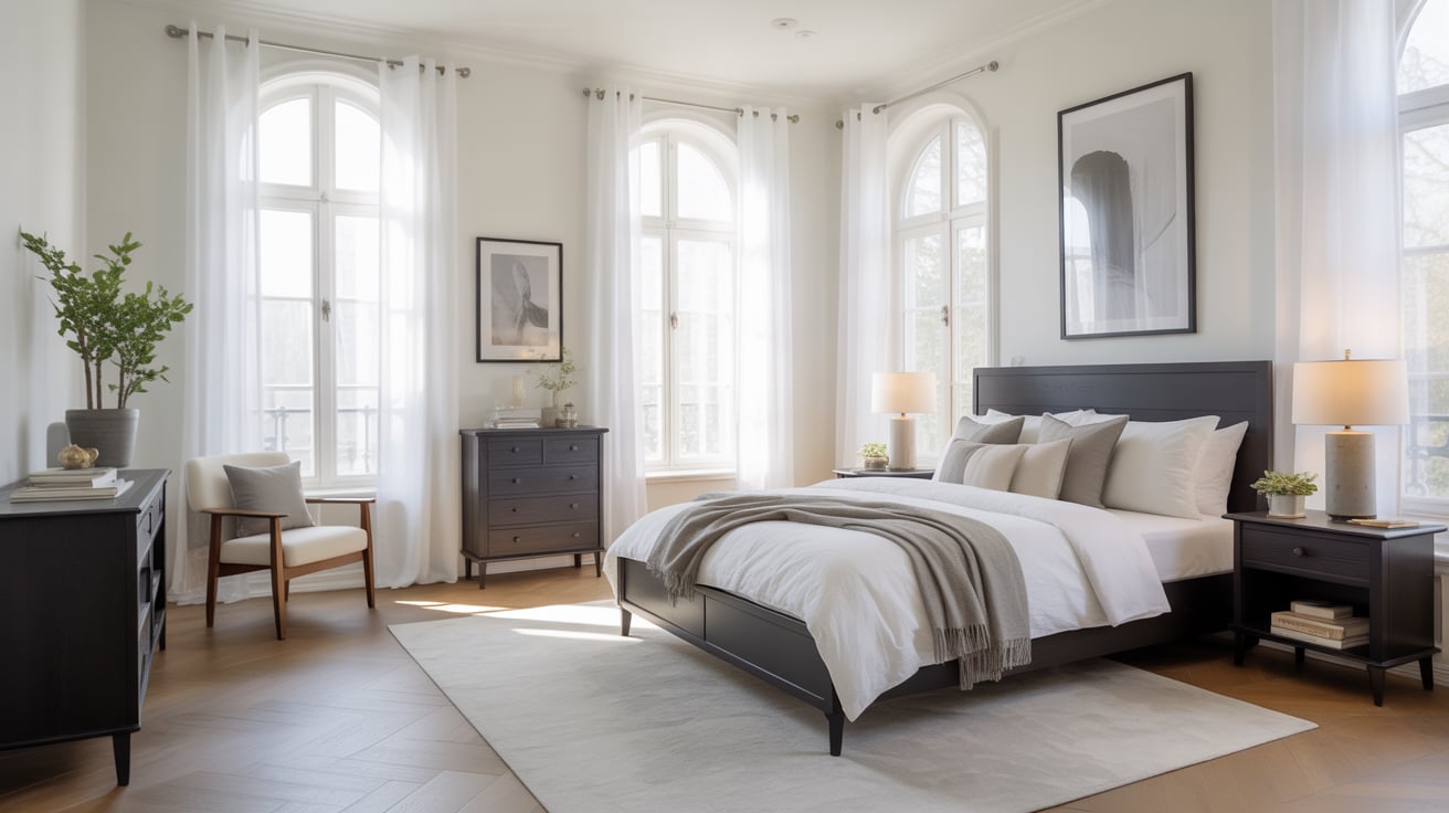 A black and white color palette can feel sharp — but adding texture instantly makes it cozy. Think fluffy white rugs, soft knit throws, and linen bedding to balance out the dark furniture. The textures bring warmth and comfort while keeping that elegant monochrome vibe.