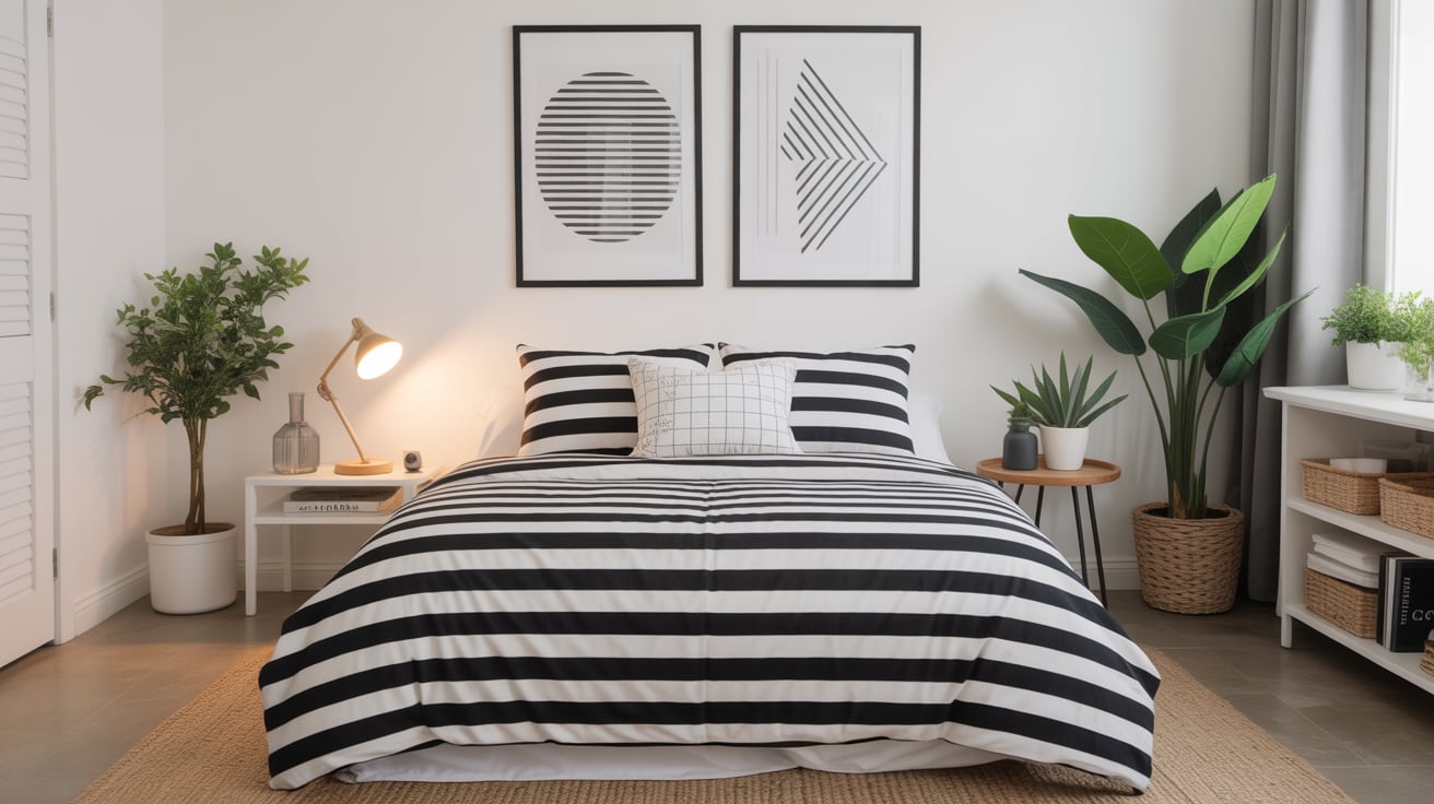 To keep it elegant, mix one bold pattern with simple textures. For example, pair striped sheets with plain white pillows and a solid black throw.
