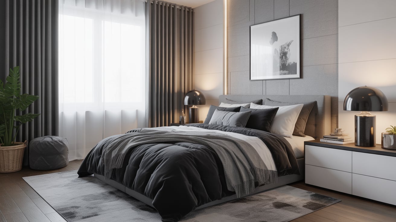 If pure black and white feels too sharp, add shades of gray between them. Gray bedding, curtains, or rugs can smooth the contrast while keeping the monochrome feel.