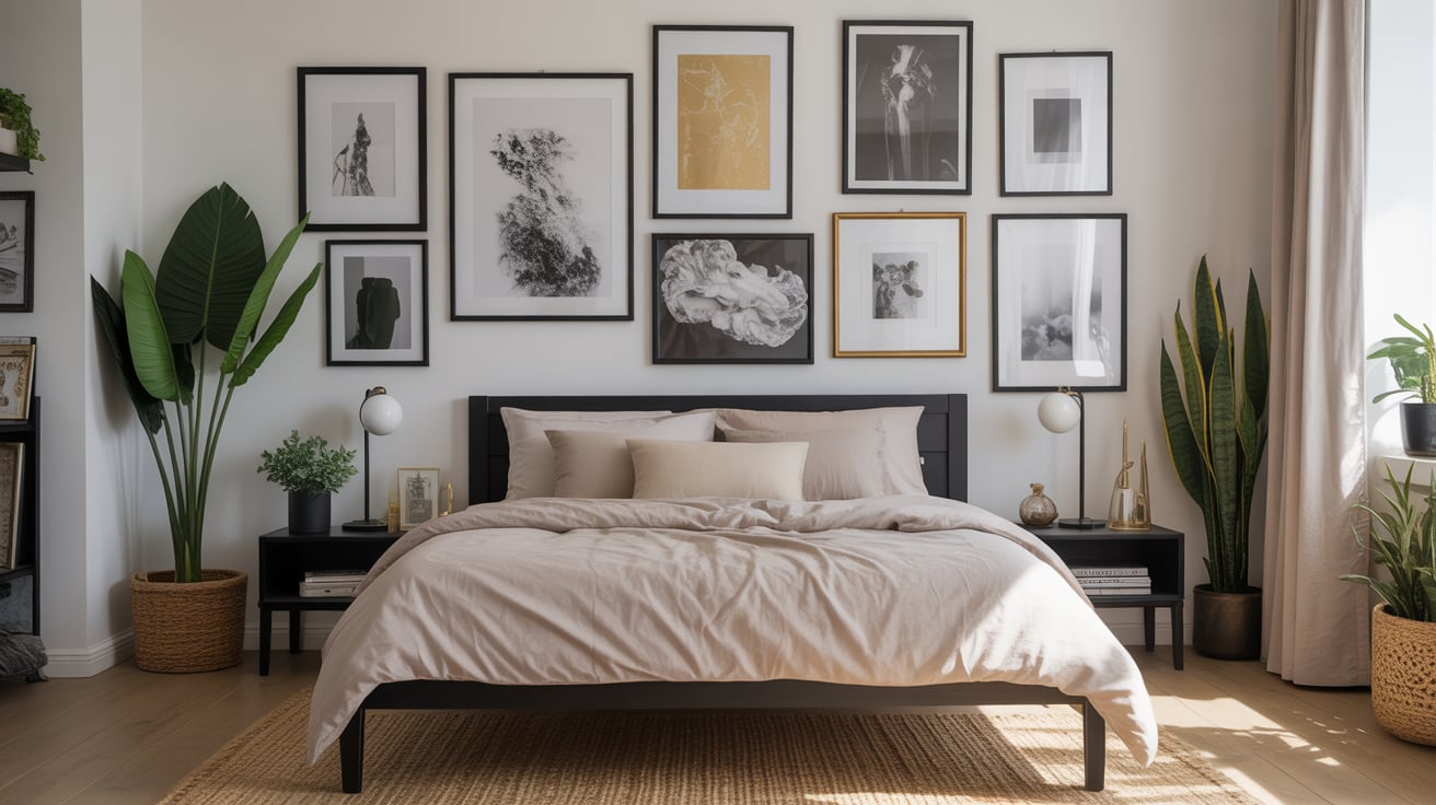 Artwork instantly transforms a simple room into a statement. Hang large prints or abstract pieces above your black bed.