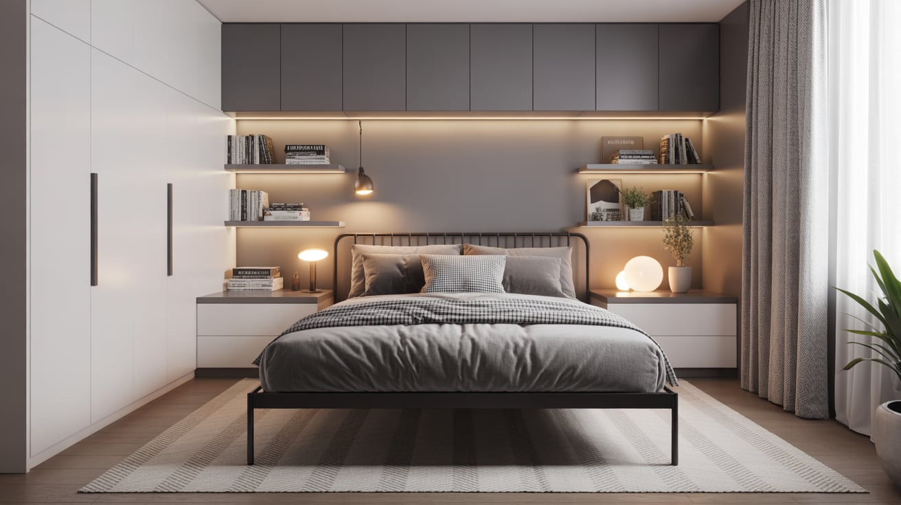 If your bedroom feels too monochrome, add color through small decor pieces — artwork, pillows, or throws.