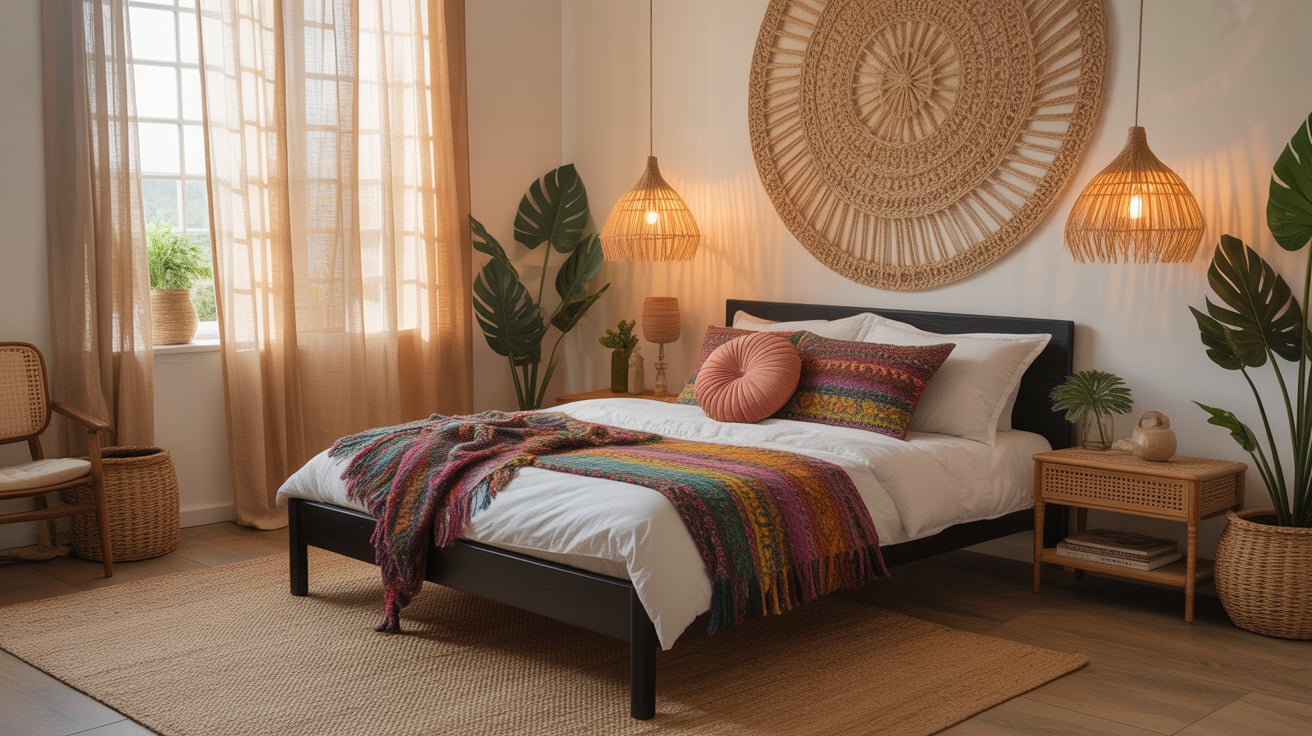 A black frame bed with textured cushions and rugs instantly feels more welcoming.