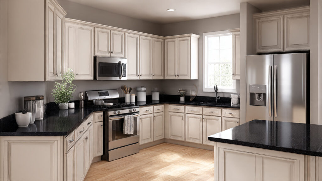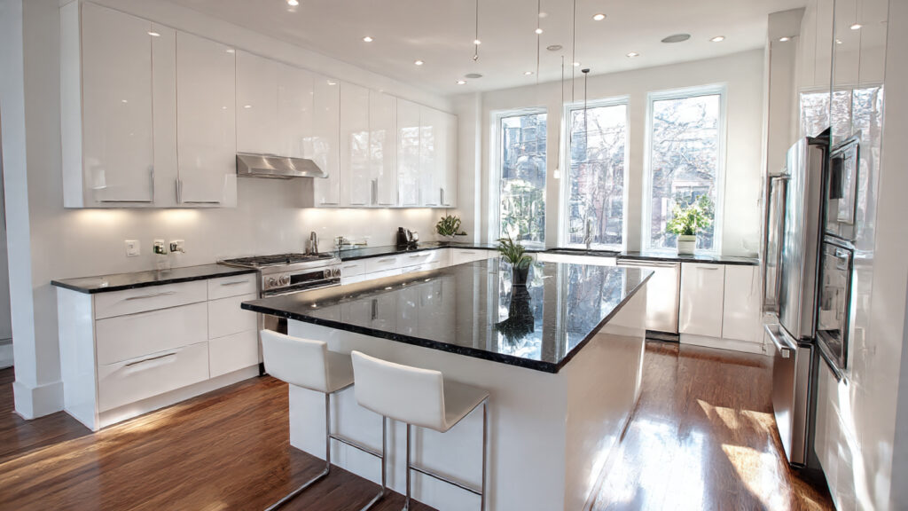 This design works because black granite pairs beautifully with light cabinets and stainless steel appliances. It’s perfect for creating a contemporary kitchen that feels open and stylish.