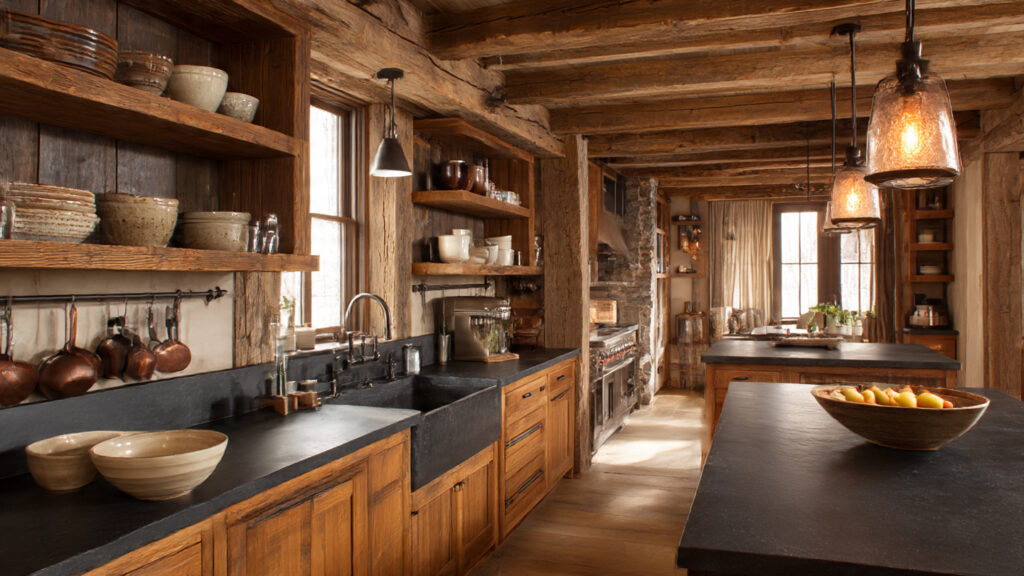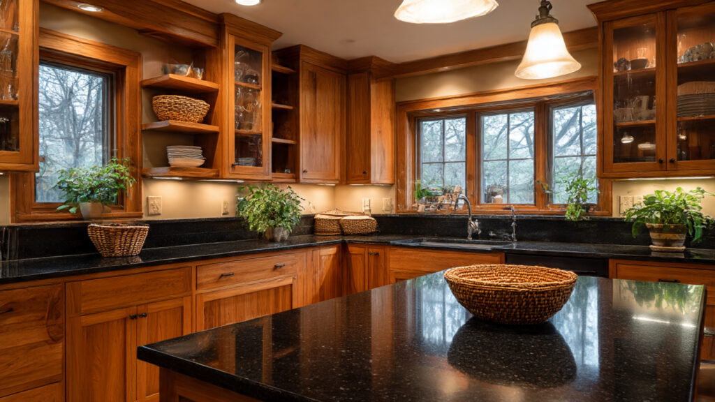 Black granite balances wood tones perfectly, creating a cozy and timeless kitchen. Choose matte or honed finishes to keep the rustic charm intact.