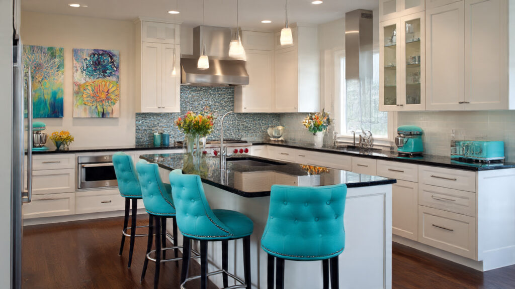 I added turquoise bar stools to my black granite island, and it turned the kitchen into a cheerful, vibrant space. Bold accents instantly brought energy to an otherwise neutral setup.