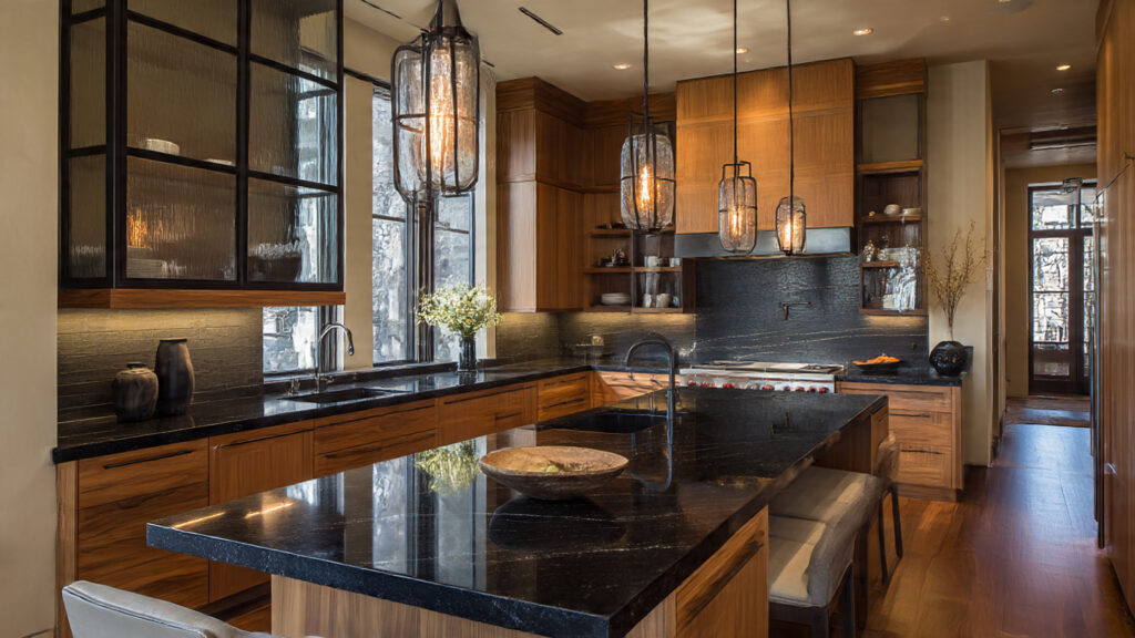 Warm wood softens the boldness of black granite, creating a balanced, cozy kitchen that feels both modern and inviting.