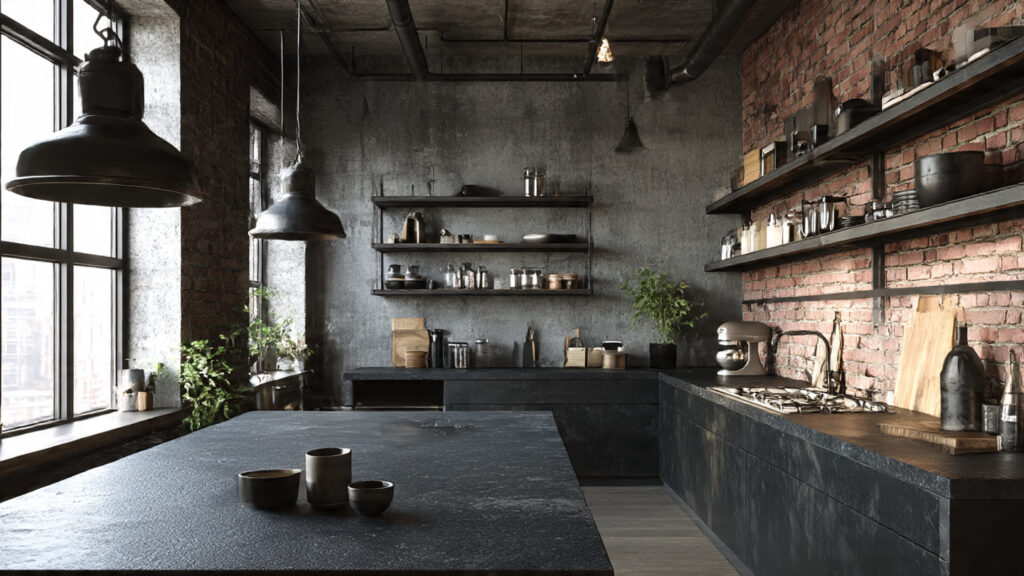In my first loft apartment, black granite countertops with concrete walls and steel shelving gave my kitchen a bold industrial vibe. It felt edgy but functional at the same time.
