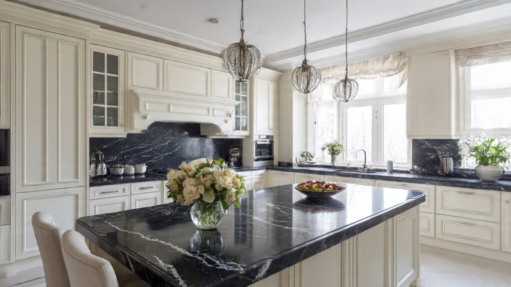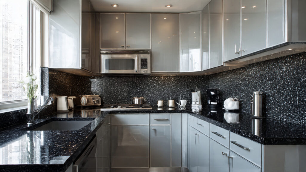 Visiting a friend’s luxury kitchen, I fell in love with black granite featuring subtle white veining — it felt like pure elegance. Even small kitchens can look high-end with this touch.