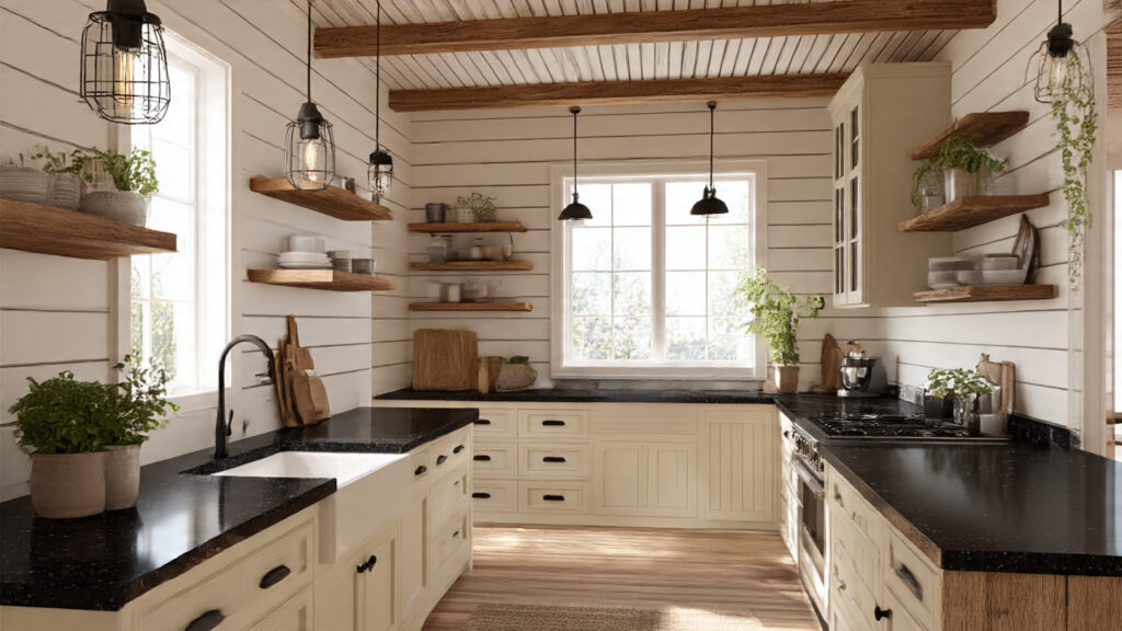 Visiting a modern farmhouse kitchen, black granite countertops stood out against white shiplap walls and cream cabinets. The mix felt cozy yet modern.
