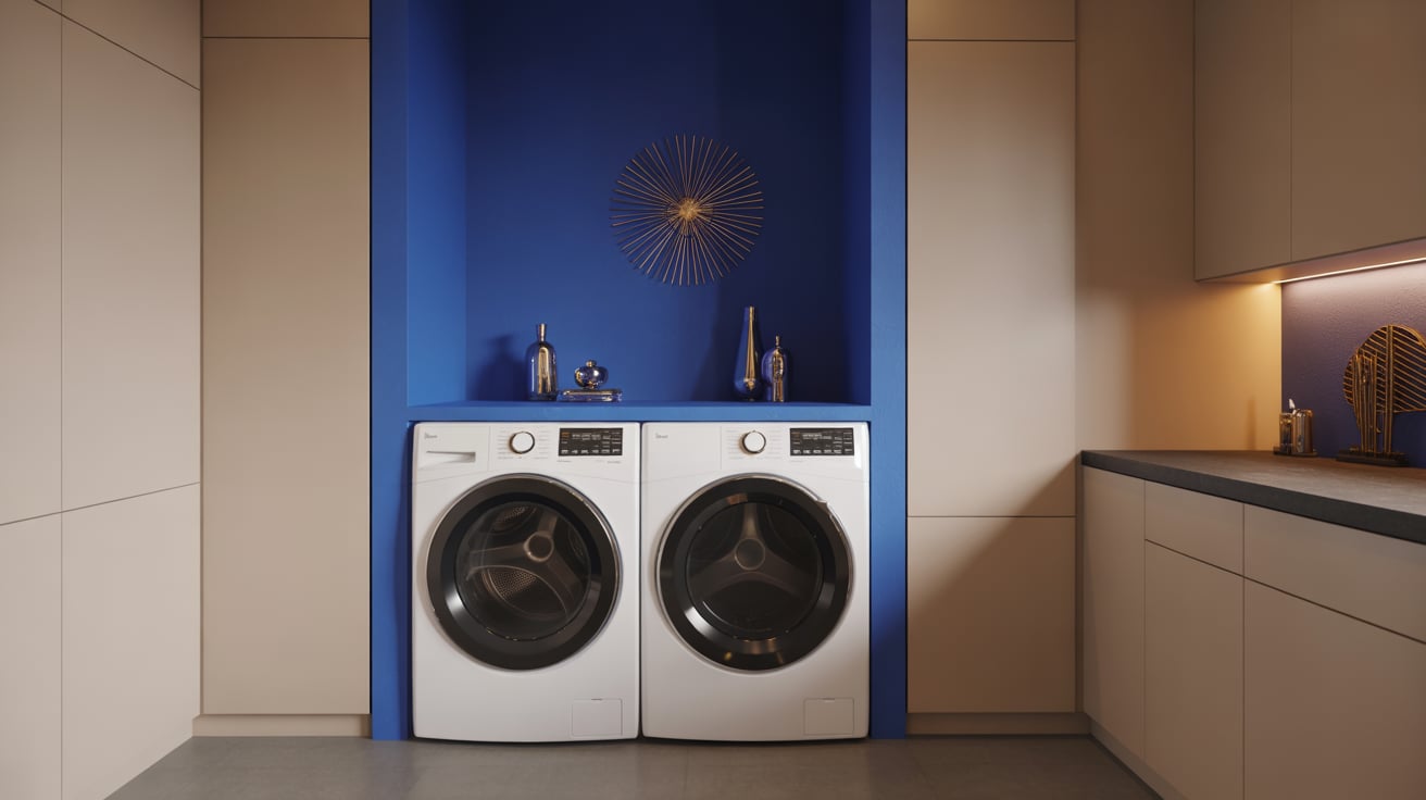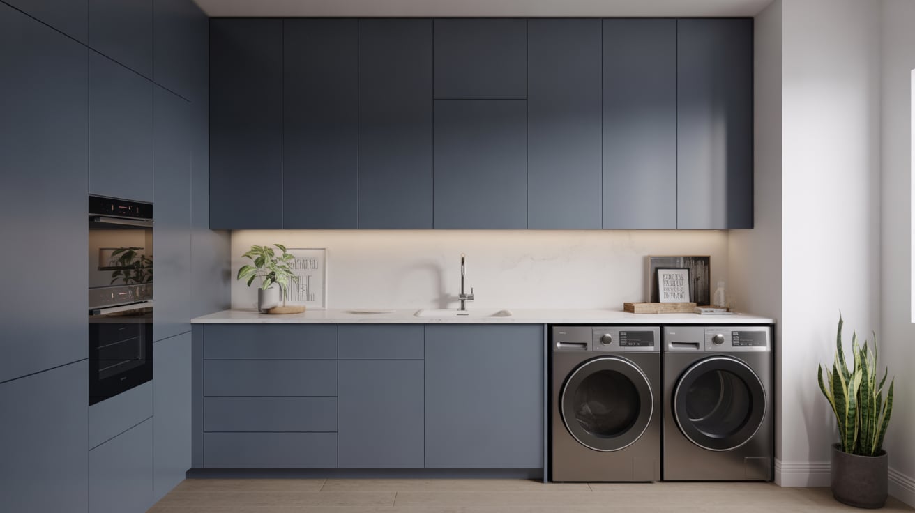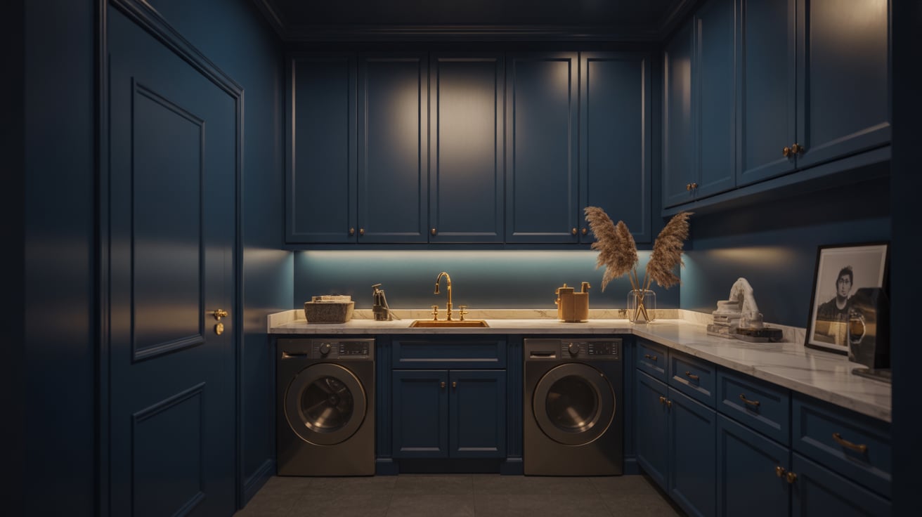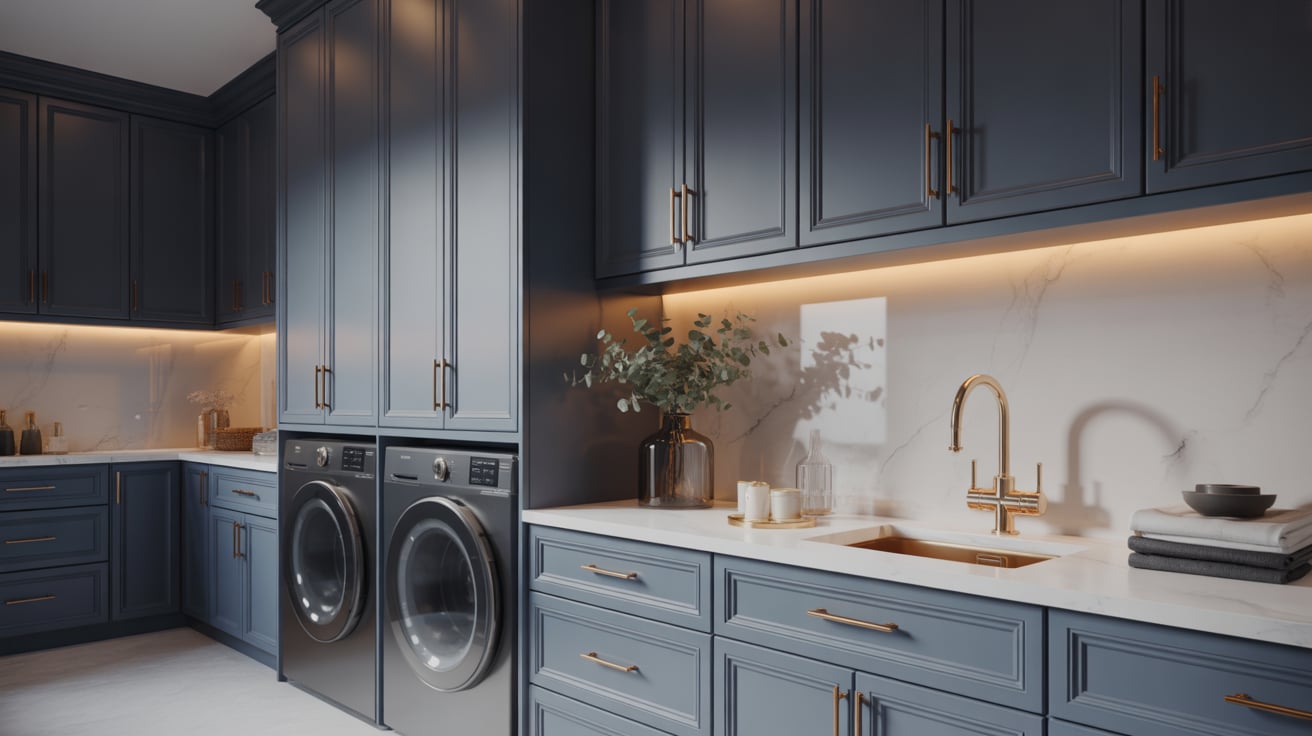 Deep navy adds depth and sophistication, while gold details bring warmth and richness. It’s perfect for medium to large laundry rooms or open-concept designs.