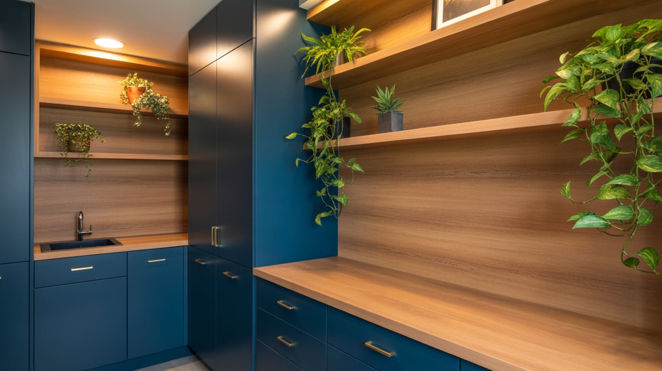 I love mixing natural textures with blue — when I added oak shelving to my navy laundry cabinets, the room instantly felt warm and balanced.