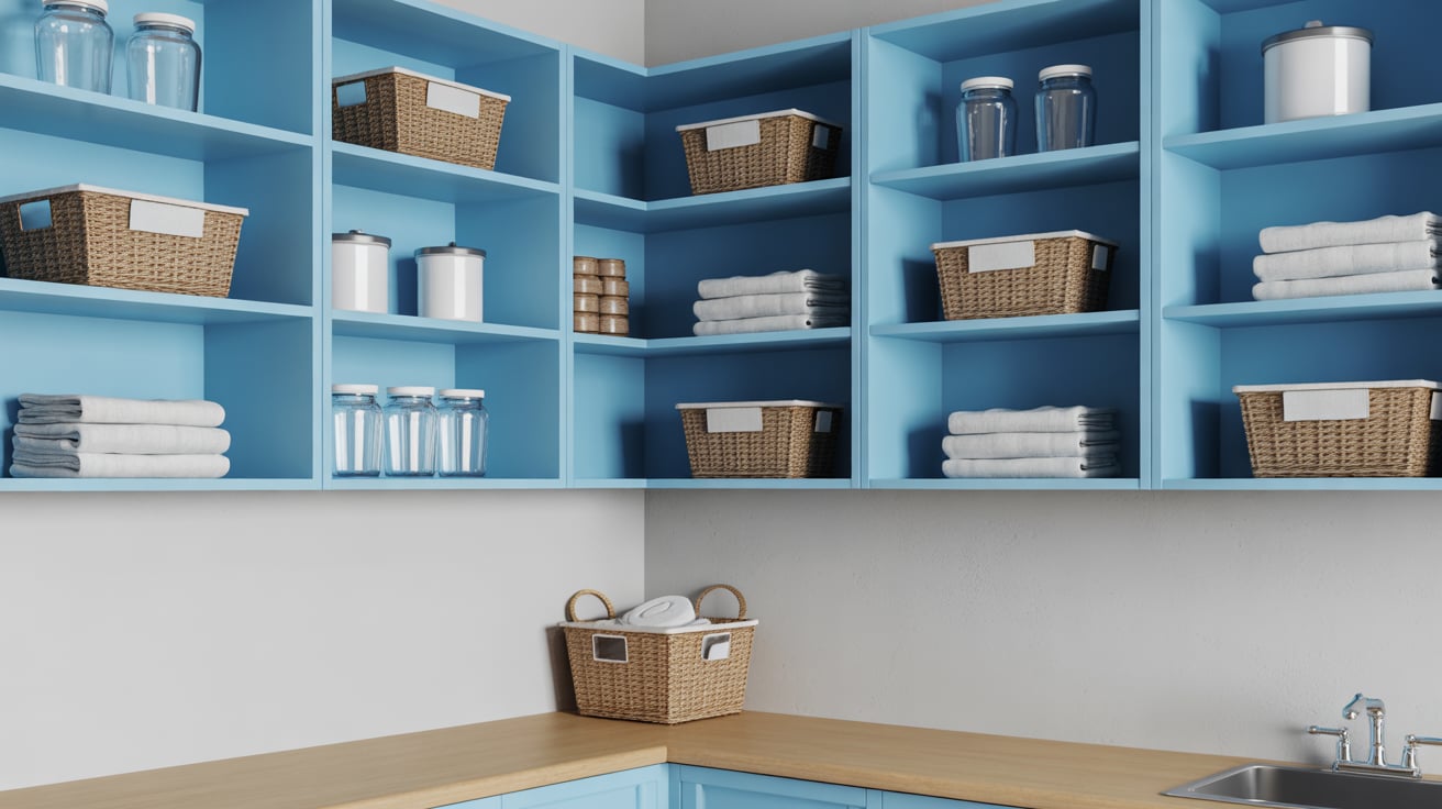 A friend of mine ditched her bulky cabinets and went for open blue shelves — and her small laundry room suddenly felt twice as big. She even styled it with jars, baskets, and folded towels like a boutique.