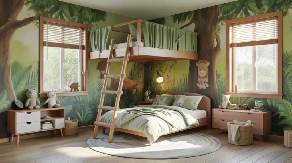 Add some fake vines from the ceiling, a few plush jungle animals, and maybe a mosquito net canopy over the bed for that authentic safari tent vibe. Pro tip: stick some LED fireflies in the netting for a cool nighttime effect.